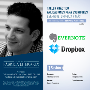El primer taller se hará el Jueves 21 de Enero a las 6.30pm, y estaremos viendo cómo utilizar Evernote, una de las herramientas más valiosas para escribir y organizar todas tus ideas, cuentos, capítulos y hasta la novela entera. Además, es excelente para guardar toda la información que puedas encontrar en Internet para investigar a fondo tus temas. También explicaré cómo utilizar Dropbox para almacenar y proteger tu trabajo, y evitar tragedias por robo, accidente o cosas peores. Más información de este taller aquí.